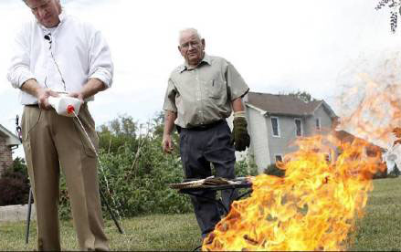 Pastor Bob put two Korans into the flames. Danny Allan is watching.