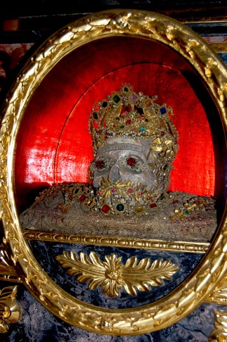 Crowned and Jeweled Skull Relic. At the Franziskanerkirche in Salzburg, Austria