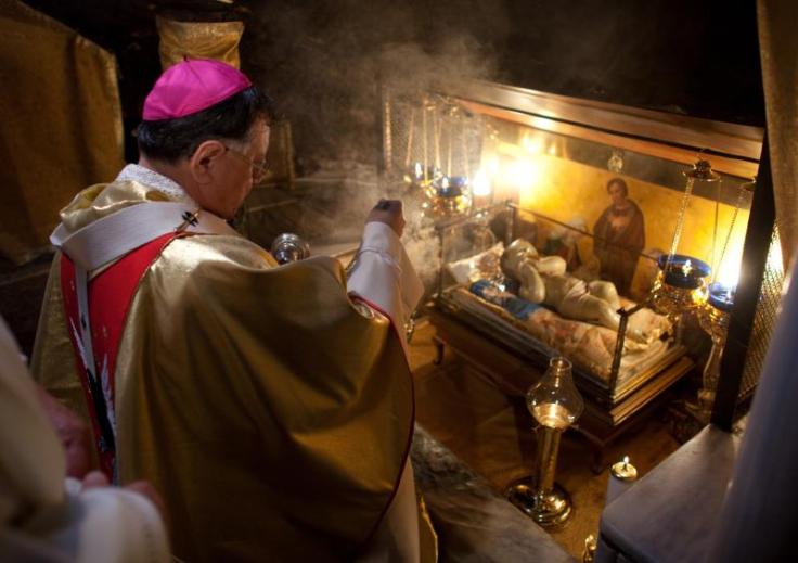 Latin Patriarch of Jerusalem Fouad Twal blesses a statue of “baby Jesus” inside in the Grotto in Bethlehem.