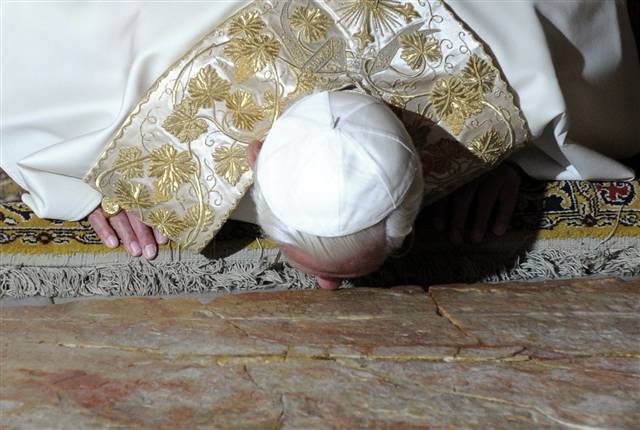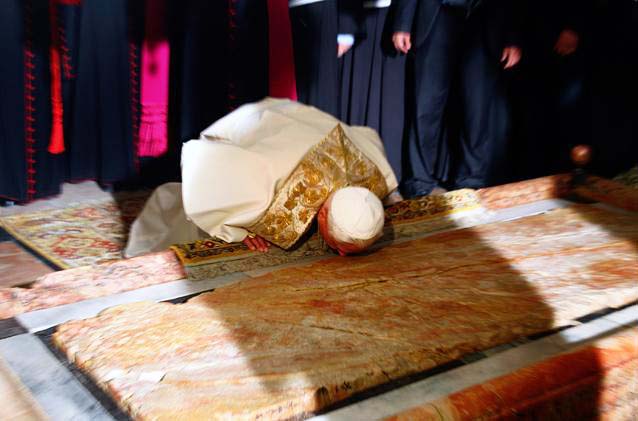 The Pope kisses the “anointing stone” in Jerusalem
