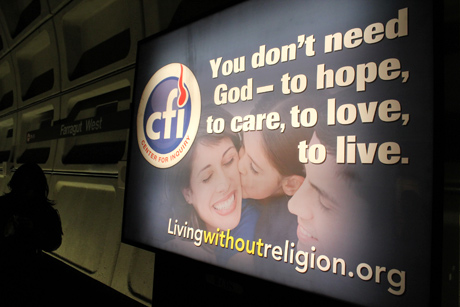 A new ad, launched by the Center for Inquiry on Tuesday, March 2, 2011, is seen here at the Farragut West Metro station in Washington, D.C.