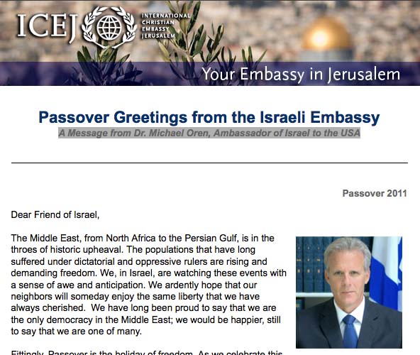 ICEJ.org has distributed an official passover greeting, where Michael Oren, Ambassador of Israel to the USA, is used as the speaker.
