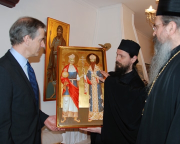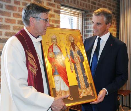 Foreign Minister Jonas Gahr Støre gave Lutheran Bishop an ikon of Saint Stephan of Dekani in Kosovo.