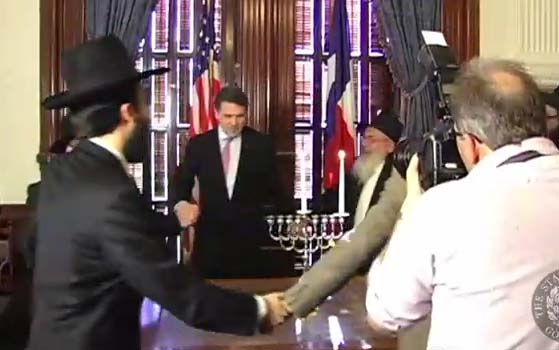 On the heels of Politico discovering the governor relied on a wealthy rabbi to support funding his USD 18,500 trips to Israel, the news organization has also uncovered a video on YouTube where he’s shown in his office last December “during a Hanukah lighting ceremony in which Perry goes the full nine yards taking part in the traditions…including dancing with the rabbis.”