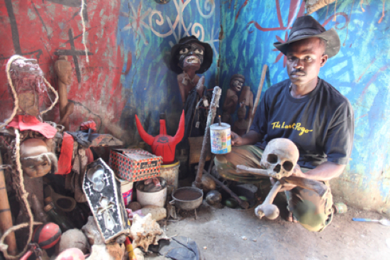 A voodoo priest showns items used on Haiti during worship of witches and spirits.