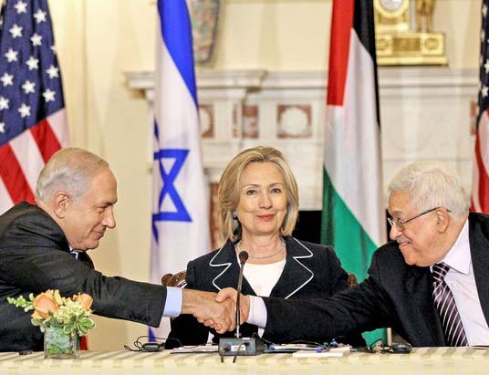 They shake hands. A political theater takes place, staged by Secretary of state Hillary Clinton.
