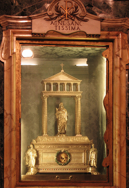 The skull of Saint Agnes of Rome, Saint Agnes in Agony Church, Piazza Navona, Rome, Italy; swiped with permission from the flickr account of Brother Lawrence Lew, OP