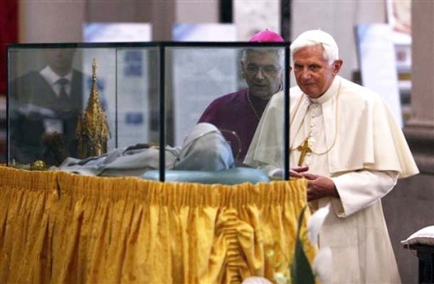Pope Benedict XVI next to Viterbo bishop Mons. Lorenzo Chiarinelli looks at the mummified body of St. Rose inside the St. Rose’s shrine during his visit at Viterbo, central Italy, Sunday, Sept. 6, 2009.