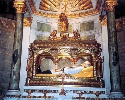 The body of Saint John Mary Vianney wearing a wax mask, found to be incorrupt by the Catholic Church. The body is entombed above the main altar in the Basilica at Ars, France.