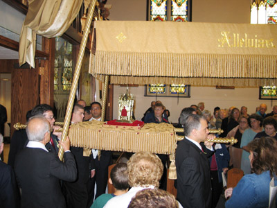 Faithful followers of the Pope, parade a cut of part of a corpse on their shoulders.