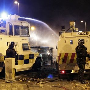 Police fired water cannon to defend themselves from petrol bombs, fireworks, stones and bottles thrown at them by both sides in running battles lasting nearly 12 hours, police said.