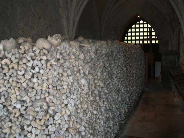 There are some 2000 skulls in the Bonehouse of St Leonard’s Church, mainly arranged on shelves so you can get a goodlook at them.