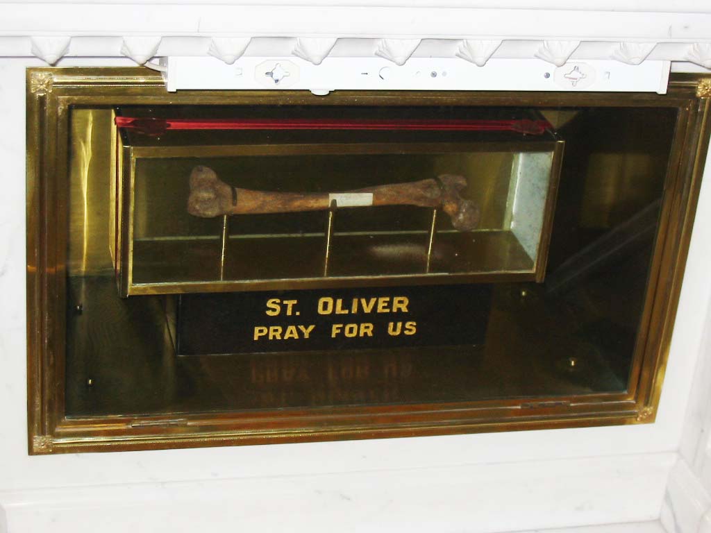 I am not sure if the bones of “St. Oliver” can hear any prayers. But the priest have at least given the worshipers a notice of whom this leg bone is supposed to have belonged too, before his grave was opened and looted by  Roman Catholic priests.