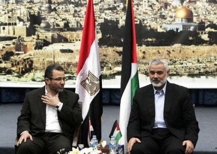 Prime Minister Hisham Qandil (left) of Fascist Egypt holds press conference in Gaza with a picture of Jerusalem as background.