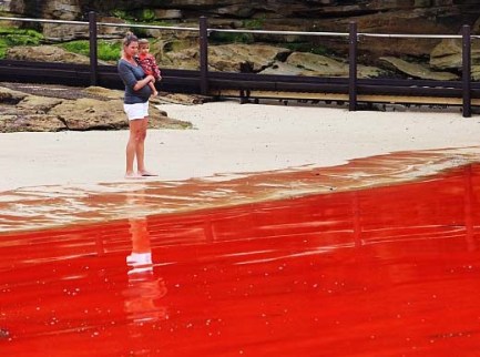 Tourists heading for world-famous Bondi Beach were left high and dry today after a rare natural phenomenon turned the water blood red.