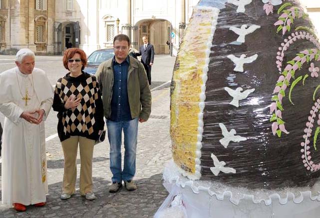 Pope Benedict XVI was presented Wednesday with an enormous, 250-kilogram (550-pound), 2.2-meter (7.2-foot) tall chocolate Easter egg by Italian chocolatier Tosca, which specializes in oversized cocoa confections.