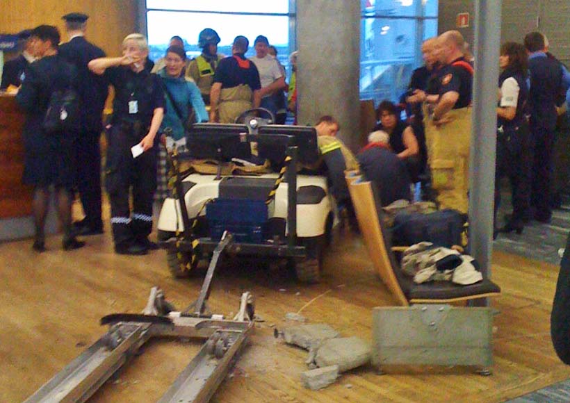In a freak accident, three persons are injured in a crash inside the airport terminal in Oslo.