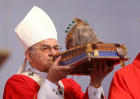 When the present 82 year old Pope came to Saint Wenceslas Basilica in Stara Bolesav, just outside Prague, the skull was properly dressed up.