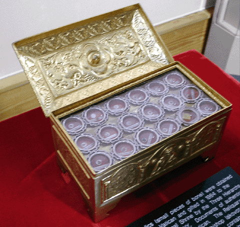 “These relics (small pieces of bone were obtained from the Vatican and gifted in 1984 to the St. Photios National Shrine by the Three Hierarchs Church in Brooklyn, NY. Documents of Authenticity were provided by the Vatican.