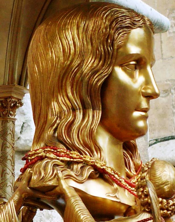 The supposed skull of Saint Mary Magdalene encased in a golden mask decorated by figurines. Christians believe she was healed by Jesus, and that He appeared to her after His resurrection.