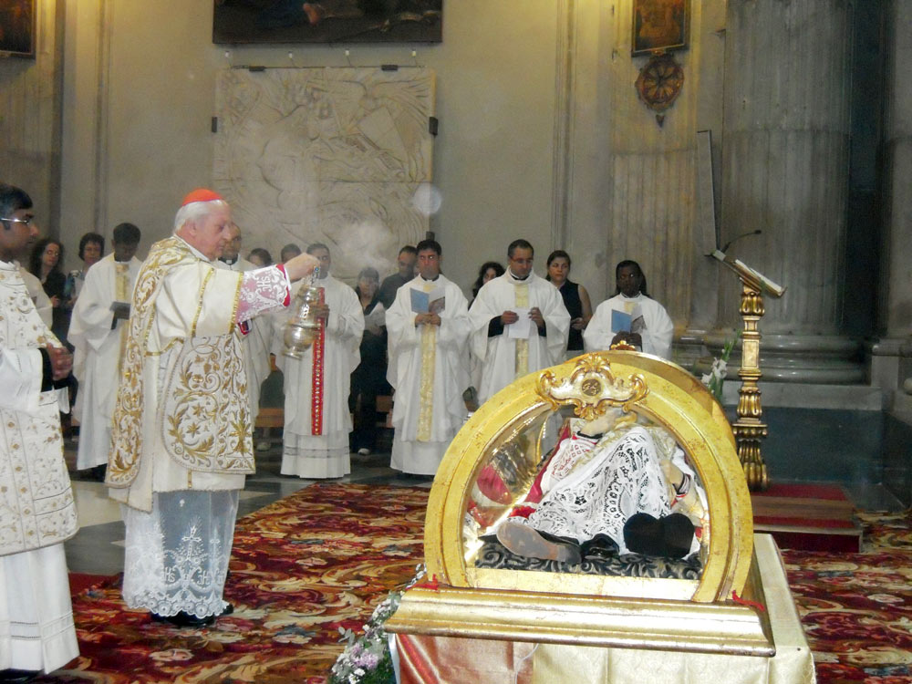 This man died 403 years ago. A wax copy of the corpse is honored in ‪Santa Maria in Campitelli‬ in Rome.