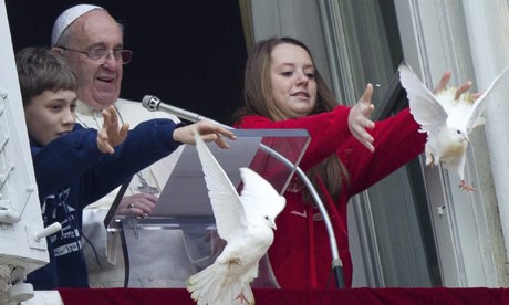 Two white doves that were released as a peace gesture by children standing alongside Pope Francis were attacked by other birds.