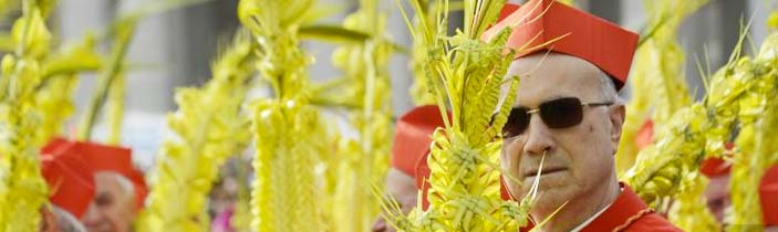 Cardinal Bretone can hinding behind palm leaves during Catholic Easter in 2013.