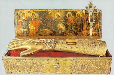 The right hand of John the Baptist can simply not be in two different places at the same time.This is the Greek version of what looks like an idol hand of gold.