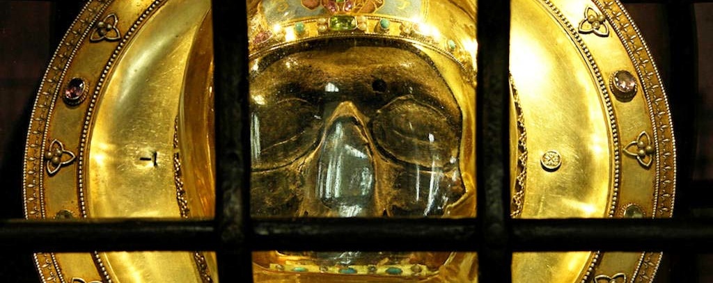 This is surely one of the most bizarre example of Church adoration and veneration of any item. Two half skulls, separated by two national borders, by two Churches that both has the Pope as their head.