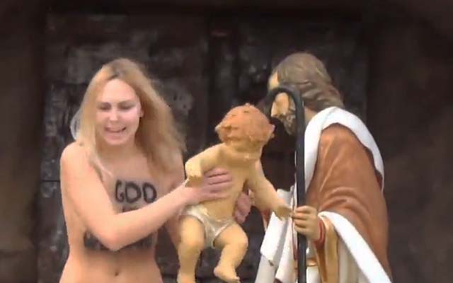 A topless FEMEN protester tried to kidnap Baby Jesus from the manger at St. Peter’s Square in Vatican City after the Pope’s Christmas message on Thursday. The activist was stopped and arrested in front of shocked believers.