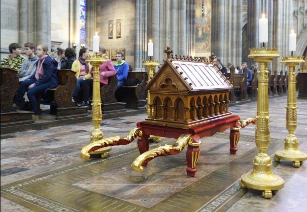 The relics of St. Adalbert are now kept in three different places inside St. Vitus cathedral: the martyr’s skull in the Hilbert Treasury, the new reliquary in the Old Archbishop’s Chapel and the remaining relics are placed inside the main altarpiece. Except for the skull which is occasionally exhibited during church holidays the relics will not be displayed for public viewing.