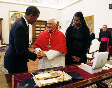 July 2009: President Obama gives the Pope some garments used by the deceased Roman Catholic bishop of Philadelphia.