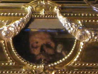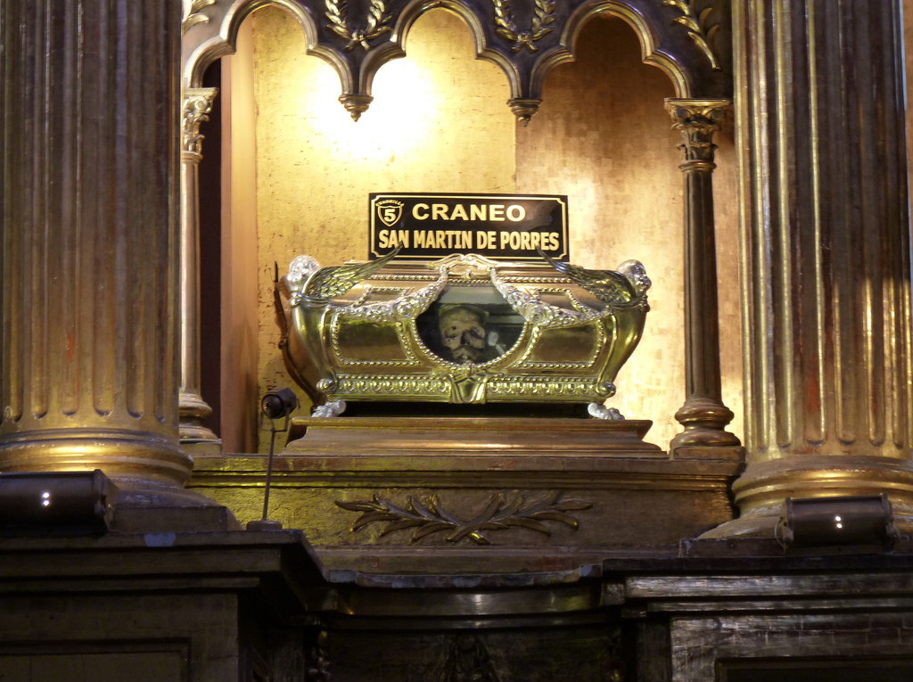 Here is the skull of a former archbishop of Lima in Peru. Besides a plastic dummy of this mortal man.