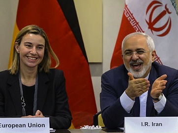 Muhammad Zarif and Federica Mogherini announce details at joint press conference in Lausanne.