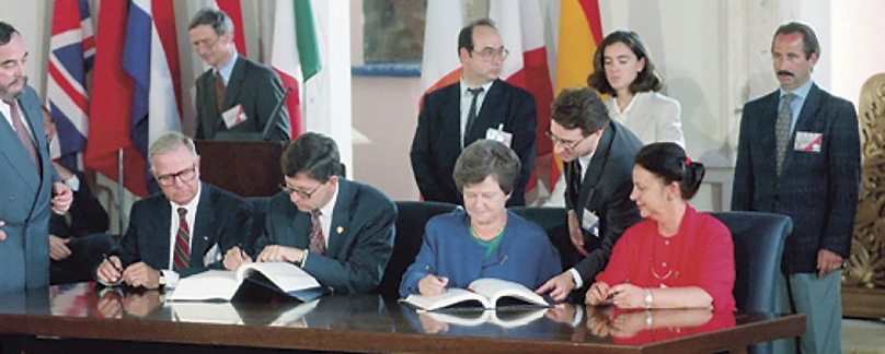 The deal to revoke the constitution of Norway is signed by Gro Harlem Brundtland on Korfu on June 24th 1994. Together with Eivind Berg, Bjørn Tore Goddal and Grete Knudsen.