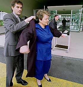 Gahr Støre carries the luggage of Brundtland in 1998, as the was the head of WHO.