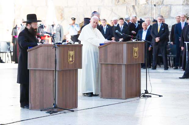 26th of May 2014. A Muslim leader, a Rabbi and the Pope pray interfaith prayers at the Western wall of the Temple Mount in Jerusalem.
