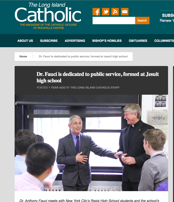 The magazine Long Island Catholic is proud of Tony Fauci: « Much of that he learned at Regis High School, a no-tuition, Jesuit-run boys college-prep school in New York City that is renowned as an academic haven. Fauci, a member of the class of 1958, told a group of alumni last May that attending the school “was the best educational period I could ever have imagined having.”