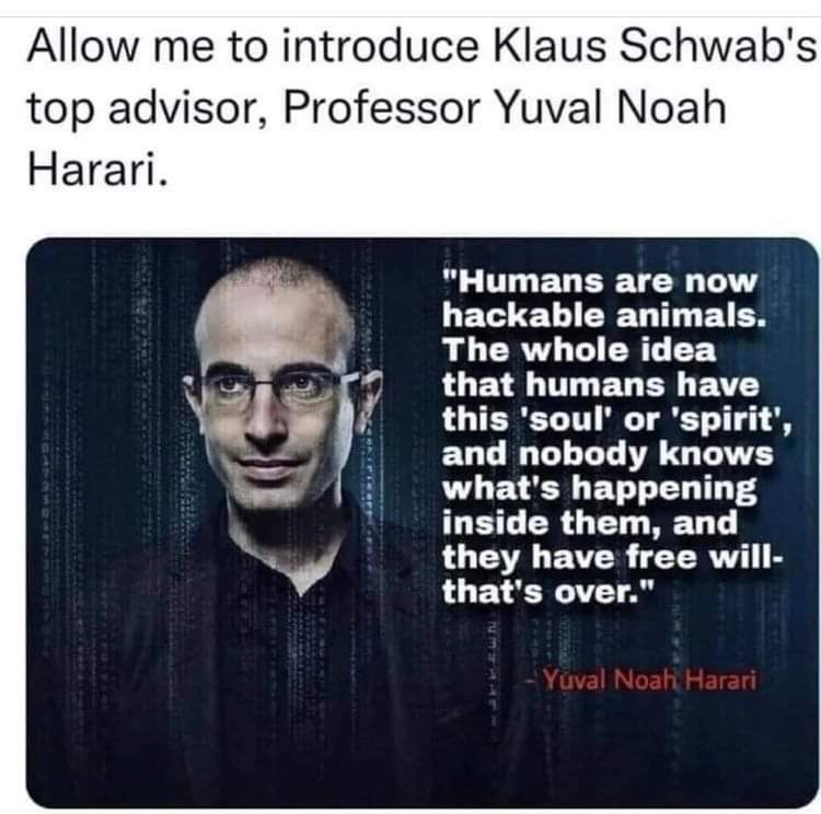 Yuval Noah Harari is correct that brainwashed humans are becoming like «hackable animals». No longer spiritual beings with free will and souls. But manipulated and programmed to do as they are being told by Artificial intelligence (AI). The globalist elite has stared to play «god » and create hybrid beings.