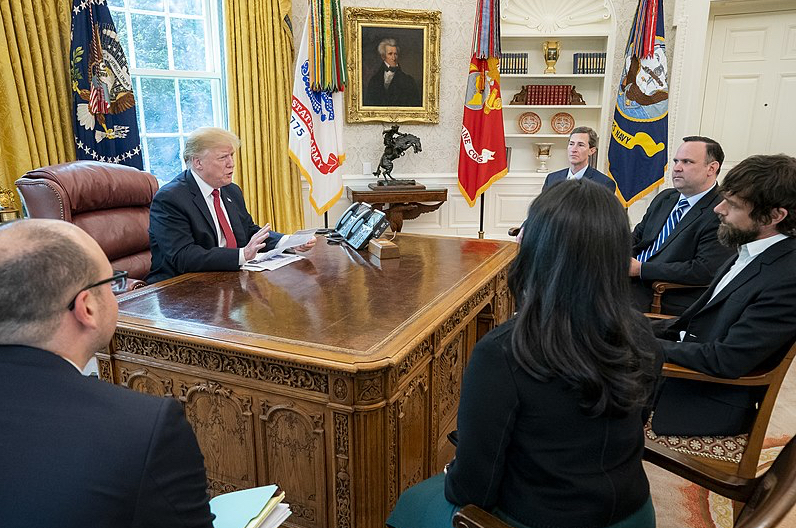 Former Twitter CEO Jack Dorsey (right, opposite Trump) sits as a Judas inside the Oval Office. Removed by Elon Musk, now branded by the Deep State as a stumbling block for them.