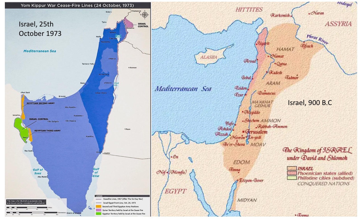 They tell you that the history of the people of Israel, which they disregard, at best is insignificant. They do not even understand modern day history from 1947 to 2023. Look at these two maps. One is the Kingdom of David, that the Messiah will restore. And the other of Israels borders 25rd of October 1973. Today, this victory should have been celebrated by free men behind safe borders. (…) Please pay attention: The Roman Catholic, not Christian, Secretary General of of the United Nations (UN), expressed the Jew-hate in his heart, on 24th of October 2023. The day we are called to honour the formation of the UN. That is another warning, but from the deepest pits of hell. (…) Men are not able to restore the Kingdom of David. Today’s wise men have made a huge ghetto around Jerusalem, manifested 7th of October 2023. (…) When will the kingdom of David be restored? As told and explained in the Word of God?