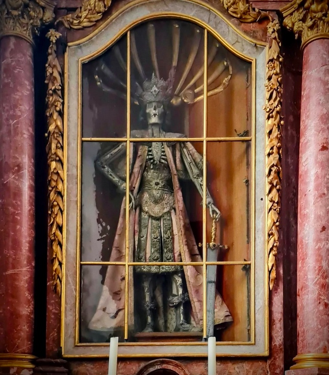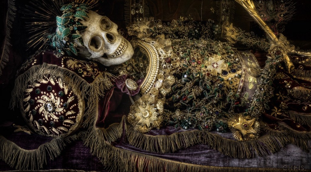 The second corpse of Saint Candidus is located in a catholic religious shrine in Italy. I have to say, that this skeleton has been better decorated. And is lying flat, so it can rest property.