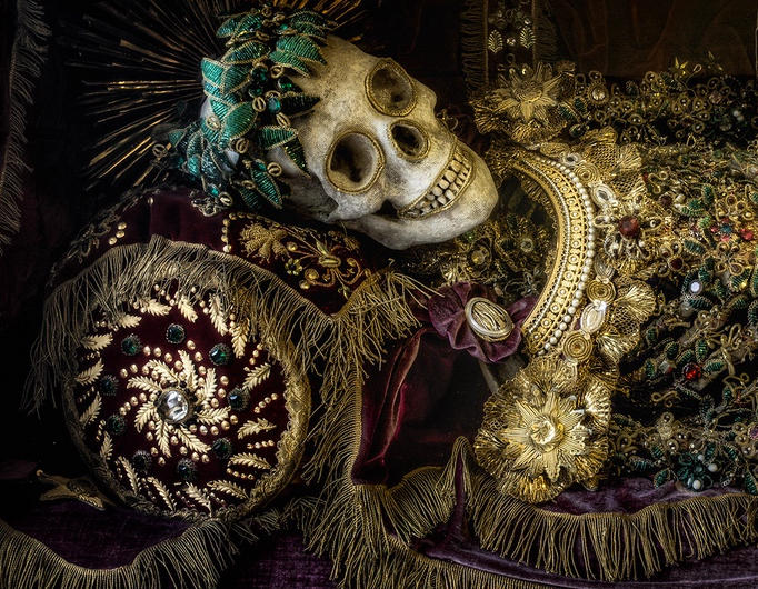 The second corpse of Saint Candidus is located in a catholic religious shrine in Italy. I have to say, that this skeleton has been better decorated. And is lying flat, so it can rest property.