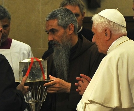 “Pope Benedict XVI looks at the Heart of the mystic saint Padre Pio in the crypt”.
