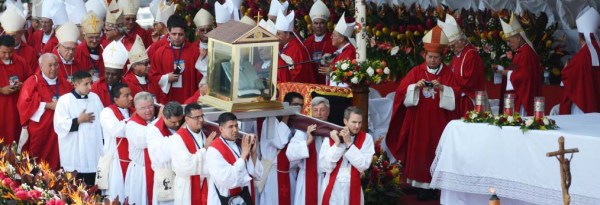 Roman Catholics in El Salvador carry the shirt of a murdered Catholic bishop on their shoulders. The Pope considers canonization.