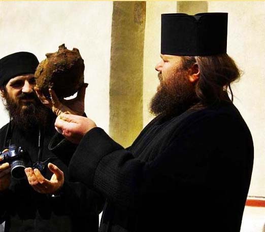 A priest at Lainici monastery lift up the cut off skull of the abbot.