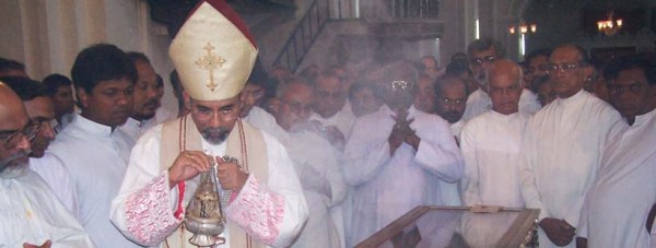 The worship of corpses, bones and skulls are a particular part of the Roman Catholic religion. This picture is exposing the present archbishop of Goa, and a couple of dozen of his priests, worshiping a corpse claimed to be of Francis Xavier of Spain.
