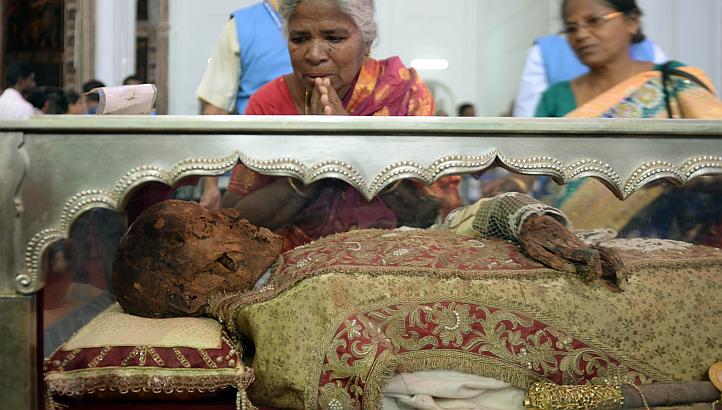What takes place in Old Goa has nothing to do with Biblical Christianity. (Click on the image to download a larger copy).A goan praying to the skeleton, called “holiness” and permitted by the local Roman Catholic archbishop.
