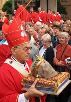 This is a photo of the procession of the skull of St. Wenceslaus in Wenceslas Square in Stara Boleslav, Czech Republic before solemn Mass.