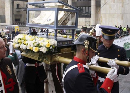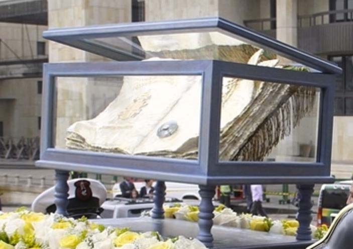 The small round cylinder inside the glass mounter contains a sample of the blood of the late Pope, ready to be carried through the streets of Bogota.